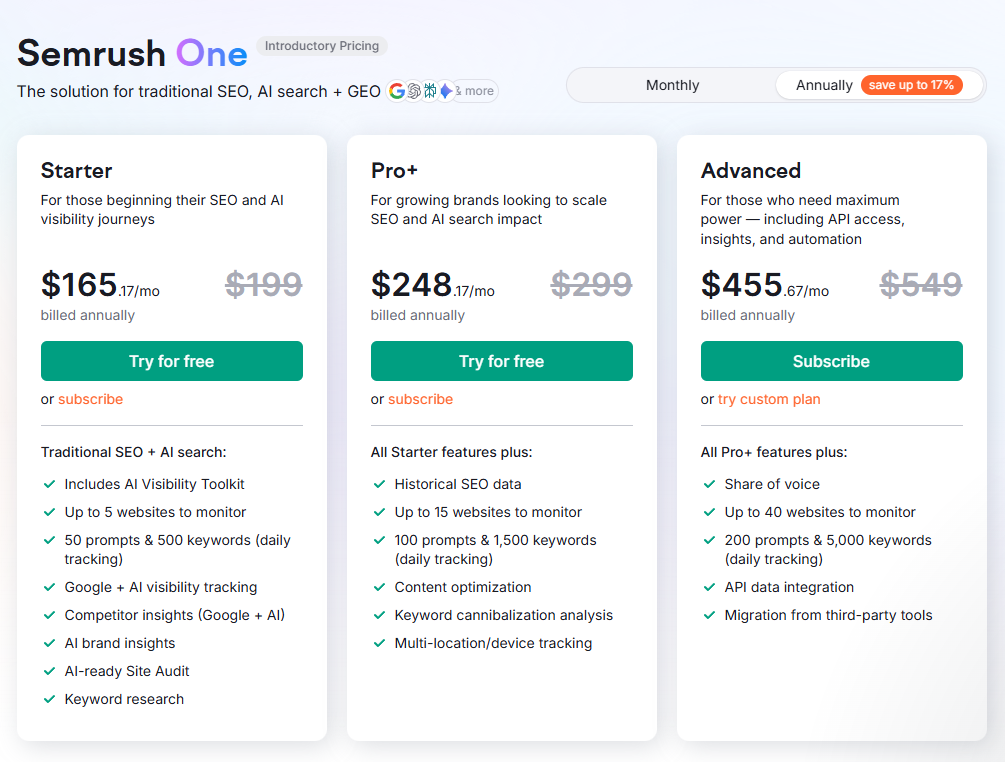 Semrush has recently introduced Semrush One, and the AI Visibility Toolkit is included in all three pricing plans. These start from $165.17/month (Starter) and go up to $455.67/month (Advanced).
